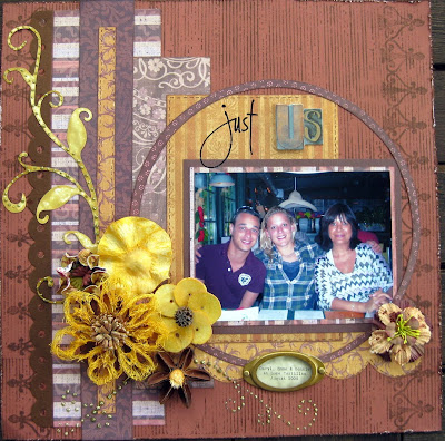 Today I was inspired by my sister, Nike, who posted a LO made of "forgotten" papers. You kwim, those papers that you have in your stash forever, and that you always skip because there are newer, more exciting papers to use. So I made this LO with papers that are at least two years old. The photo is of my nephew, his girlfriend and me made this summer. I stamped the background paper with Studio 490 stamps, and I doodled some faux stitching and stickle swirls. TFL Bonnie
